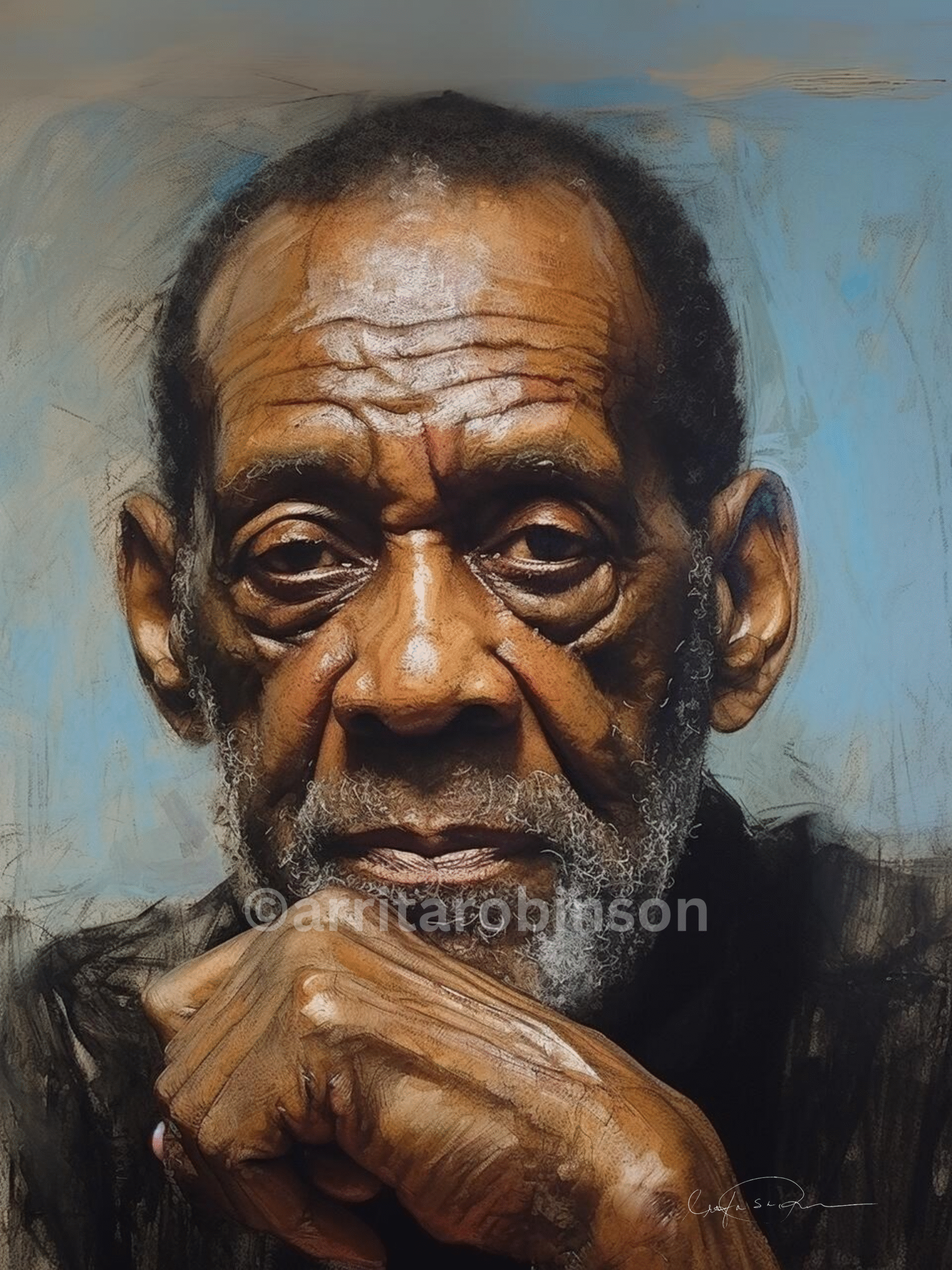 As the artist, this portrait represents one of my most profound explorations of wisdom, lived experience, and the sacred beauty of our elders. Every line on this man’s face tells a story, and I wanted to honor each one.
