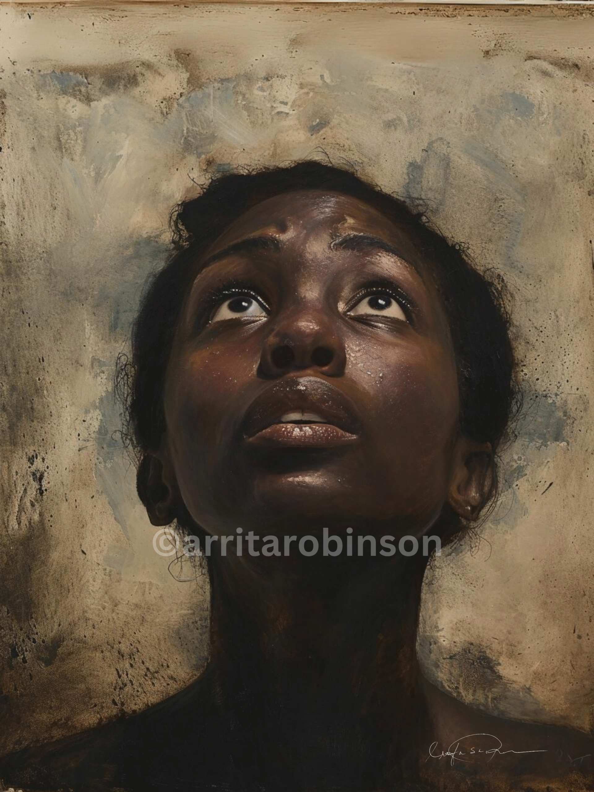 As the artist, this portrait captures a moment of spiritual ascension, hope, and powerful vulnerability. That upward gaze speaks to aspiration, prayer, and the kind of strength that comes from looking beyond present circumstances.